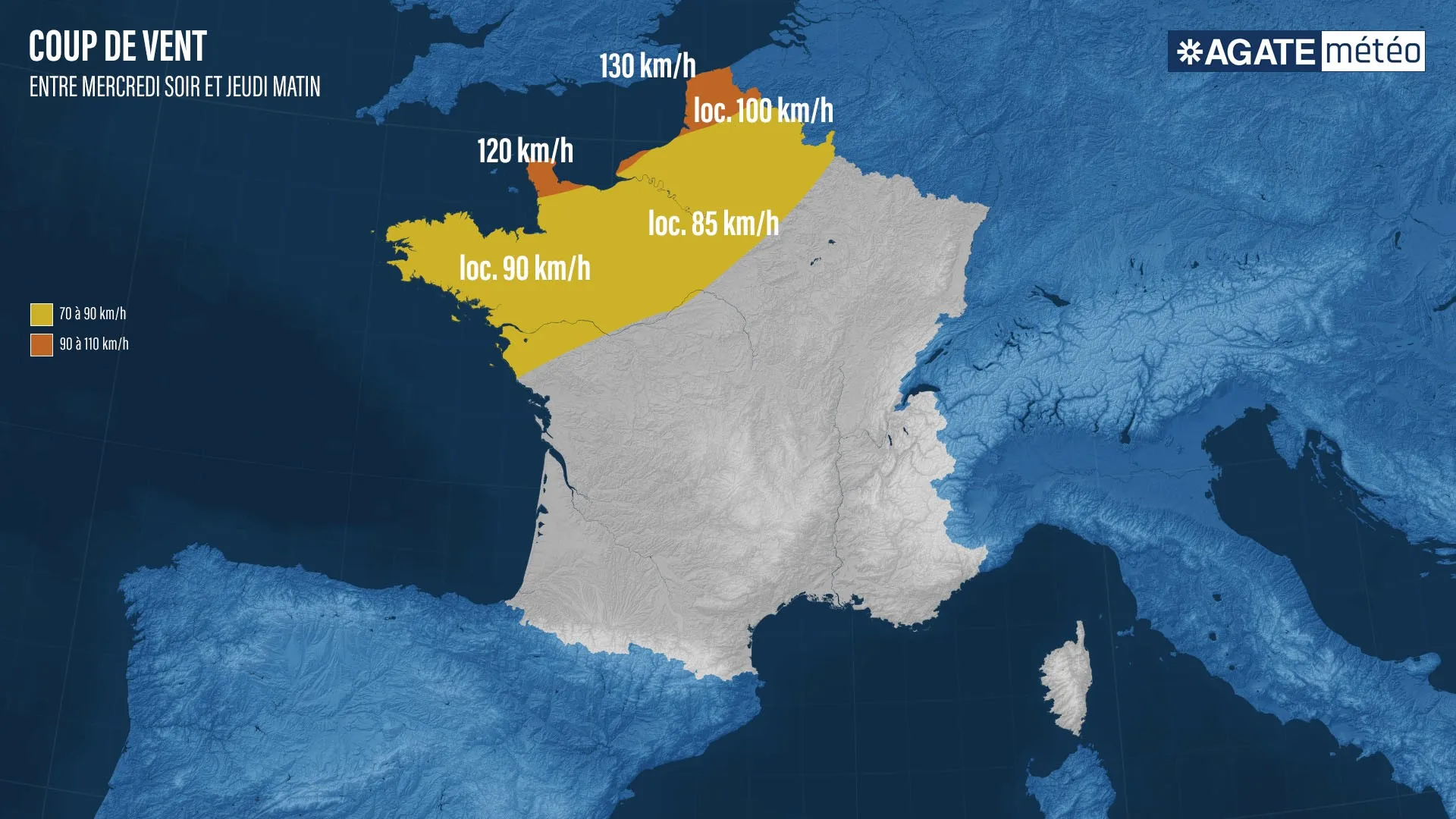 Un premier coup de vent interviendra entre demain après-midi et jeudi matin sur une axe s’étendant des Pays de la Loire à la Belgique et en passant par le Bassin parisien. Les rafales estimées sont de l’ordre de 70 à 90km/h dans les terres, localement 100km/h sur l’Ouest du Pas-de-Calais, 90 à 110km/h sur la côte d’Opale, jusqu’à 130km/h sur les caps exposés. L’indice de confiance pour ce premier coup de vent est de 4/5.