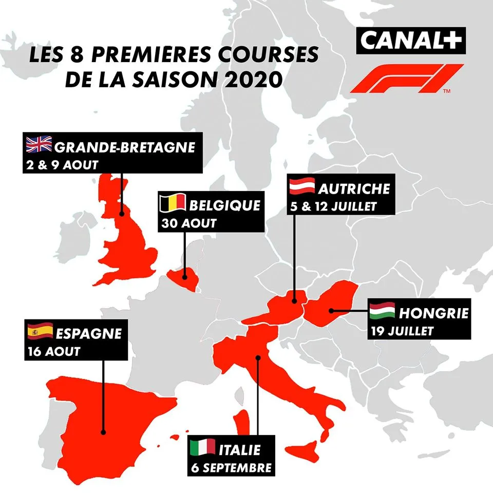 CANAL + communique les dates des 8 premiers Grand Prix de Formule 1 de la saison 2020.