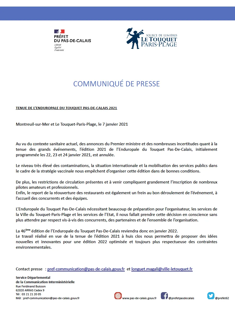 Malgré tous nos efforts, nous avons le regret de vous annoncer la décision prise en concertation par les autorités préfectorales et la municipalité du Touquet-Paris-Plage d’annuler la tenue du 46ème Enduropale du Touquet Pas-de-Calais.