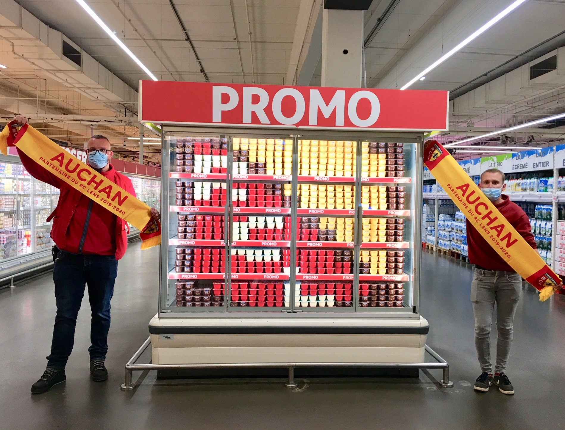 2 salariés du magasin Auchan Arras se sont amusés à former le logo du RC Lens avec des crèmes dessert !
