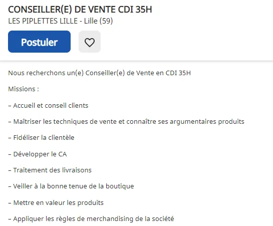 Le magasin de vêtements "Les Piplettes" à Lille recrute un(e) Conseiller(e) de Vente en CDI de 35h/semaine.