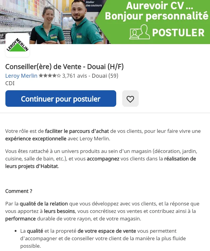Leroy Merlin à Douai recrute Conseiller(ère) de vente pour un poste en CDI.