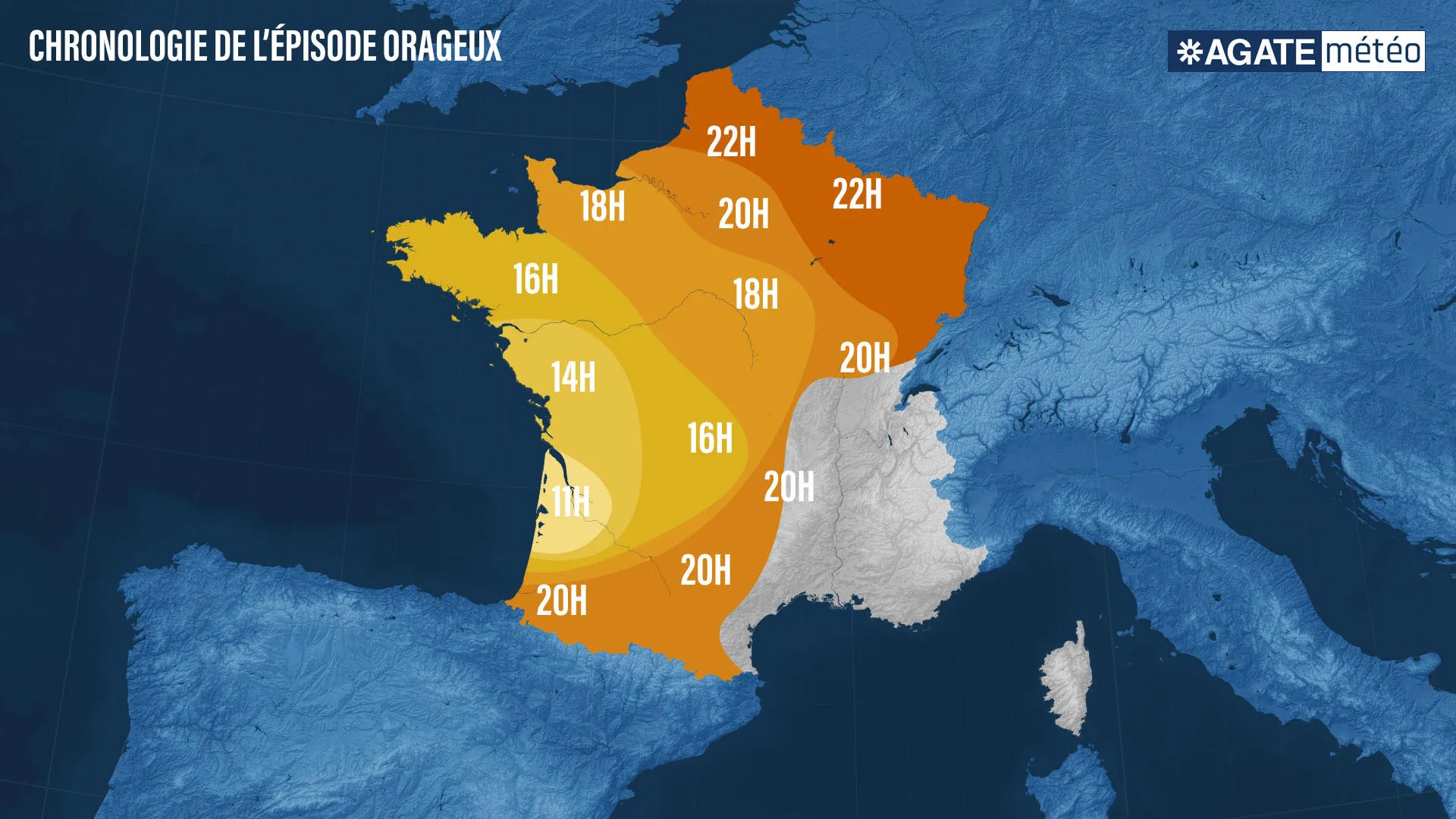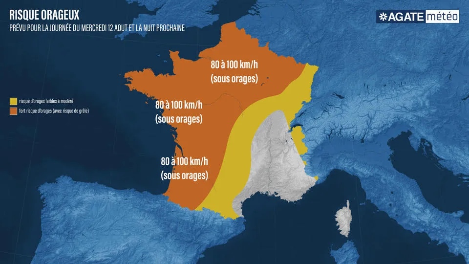 Une dégradation orageuse plus marquée, se mettra en place pour cette journée de mercredi, sur un axe s'étendant des Pyrénées en remontant vers les Hauts-de -France et en passant par le Bassin Parisien. Ces orages ont débuté depuis ce matin sur la Nouvelle Aquitaine. Ils remonteront vers le Pays-de-la-Loire, la Bretagne et la Normandie en en cours d'après-midi. Ils gagneront le Bassin Parisien en début de soirée, puis les Hauts-de-France ainsi que les Ardennes en fin de soirée. A l’arrière, des cellules orageuses, parfois actives, sont prévues des Pyrénées en remontant vers le Massif Central.