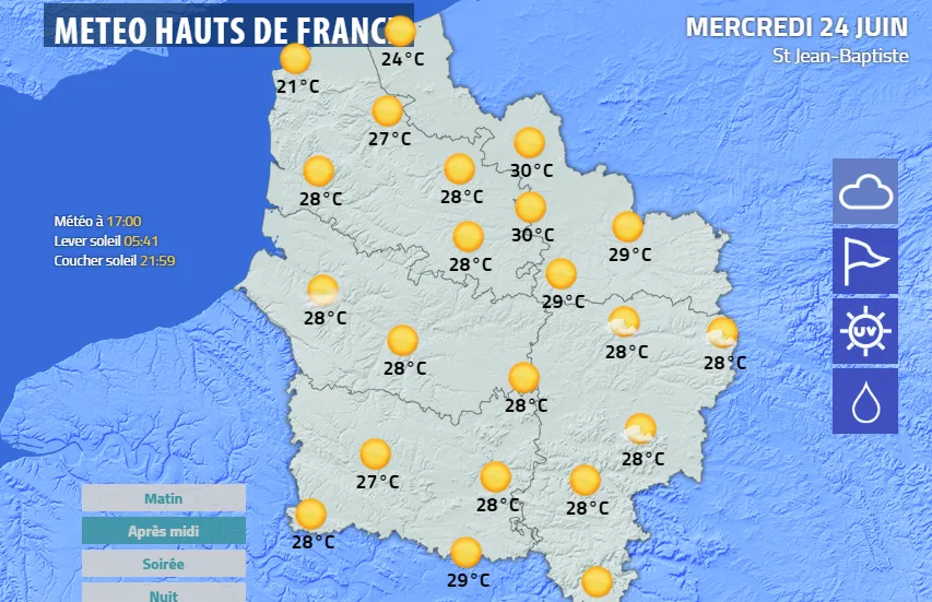 Les températures minimales avoisineront les 11 à 13°C et varieront de 19 à 21°C l'après-midi avec 20°C sur Calais(Audresselles et Rety), 19°C sur Boulogne(Boursin et Frencq), 20°C sur Dunkerque(Bierne et Warhem), 21°C sur Saint Omer(Ste Marie Cappelle et Westbécourt) et Saint Pol(Heuchin et Eclimeux), 21°C sur Lille (Houpelines et Ronchin), Lens(Aix Noulette et Vermelles), 20°C sur Valenciennes(Petite Foret et Abscon), 21°C sur Arras(Heninel et Athies), 21°C sur Cambrai(Malincourt et Raillencourt Ste Ole) et 20°C sur Maubeuge(Limon Fontaine et Férrière la Grande). 20°C sur Amiens et Mons.