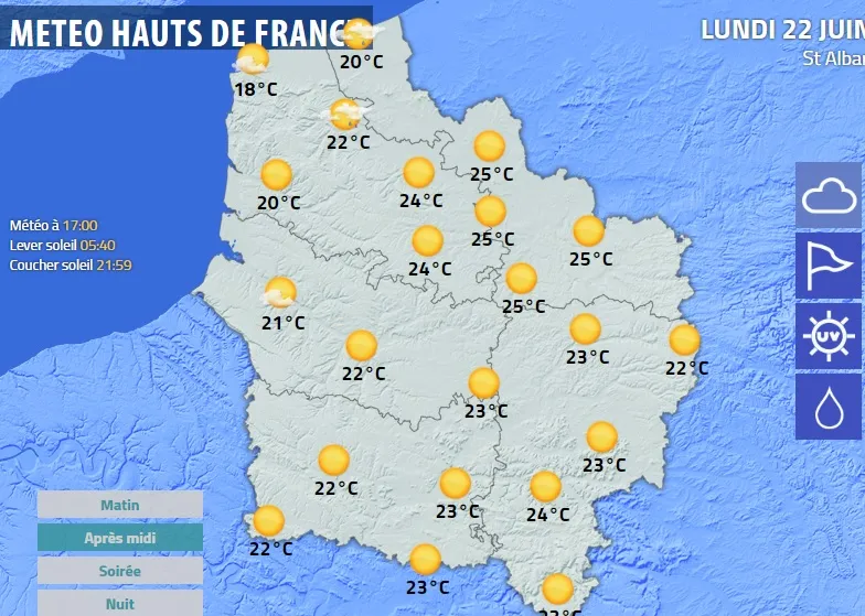 Les températures sont en hausse, mais restent un peu justes pour la saison, les minimales seront comprises entre 9 et 12°C et varieront de 20 à 23°C l'après-midi avec 22°C sur Calais (Zouafque et Landrethun), 21°C sur Boulogne(Wimereux et Terlincthun), 20°C sur Dunkerque(Hoymille et Quaedypre), 23°C sur Valenciennes(Raismes et Anzin), 22°C sur Maubeuge(Haumont et Avesnes sur Helpe), 22°C sur Cambrai(Baralle et Esnes), 23°C sur Arras(Maroeuil et Beaurains), 22°C sur Lille(Lomme et Fromelles), Saint Omer(Clarques et Steenbecque) et Saint Pol(Ambrine et Coupelle Neuve). 22°C sur Chaulnes et Menin.