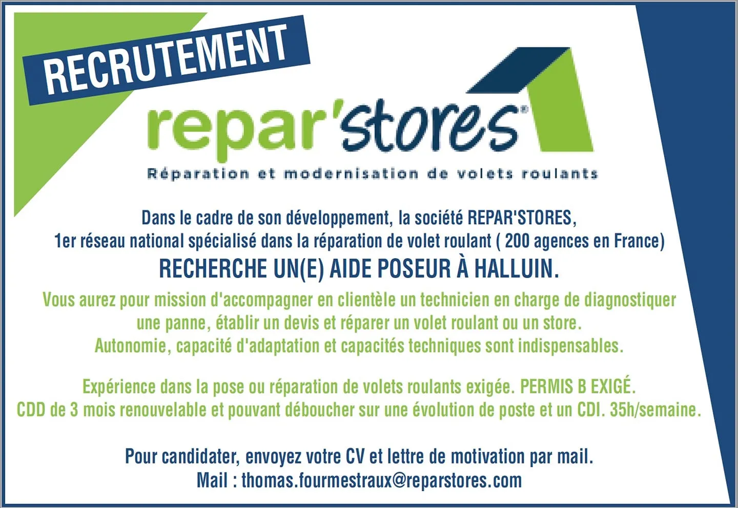 Dans le cadre de son développement, la société Repar'Stores, 1er réseau national spécialisé dans la réparation de volet roulant (200 agences en France), recherche un(e) aide poseur à Halluin.