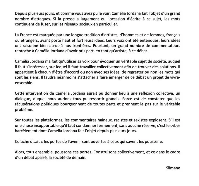 Slimane soutient les propos de Camelia Jordana dans une lettre