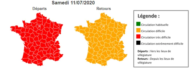 Le calme reviendra progressivement sur les routes dimanche 12 juillet. La journée est verte dans le sens des départs, sauf dans l’Ouest qui est orange.