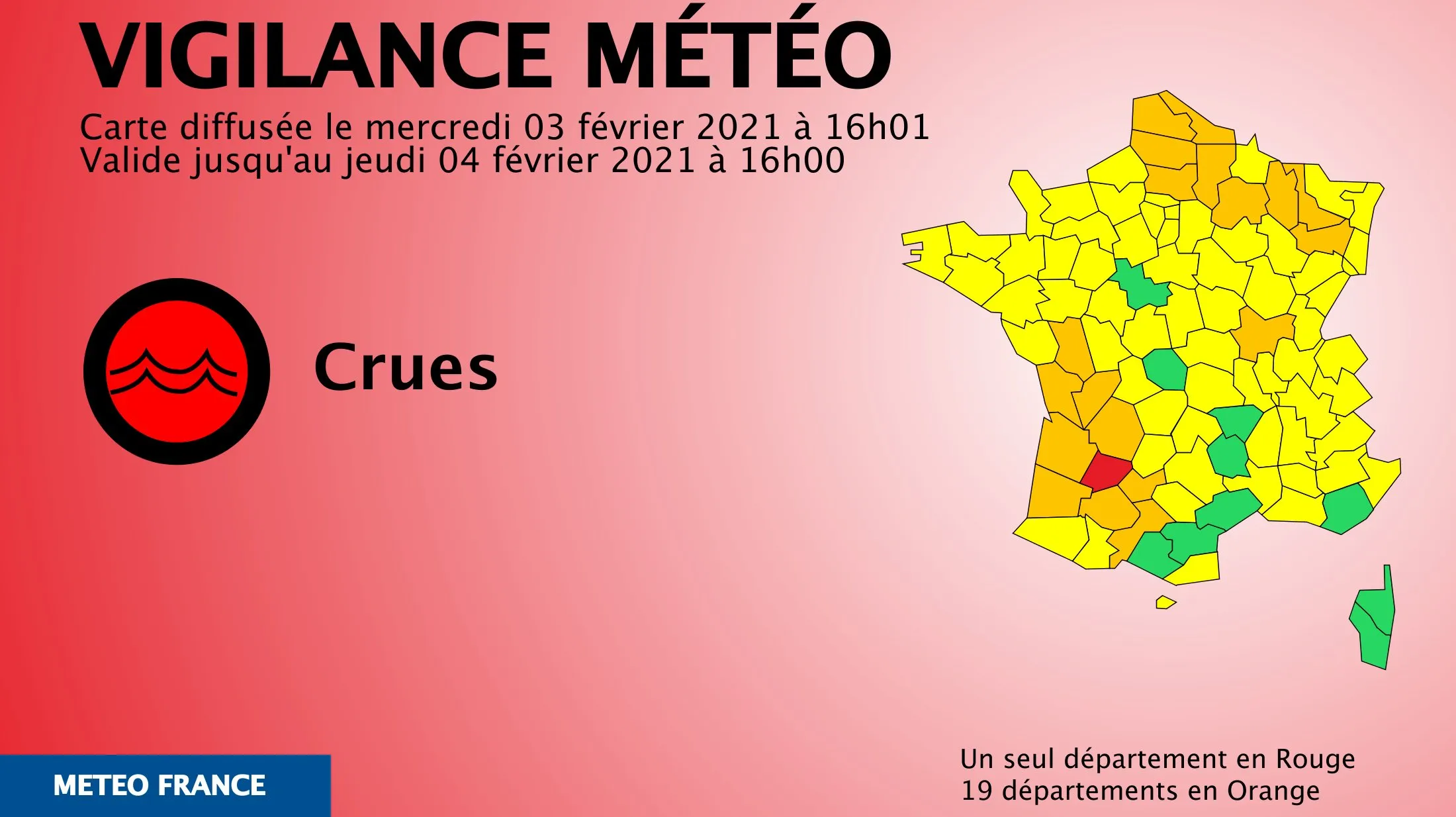 19 départements sont en vigilance orange crues et vent violent et 66 départements sont en vigilance jaune pour des crues, avalanches ou vent violent.