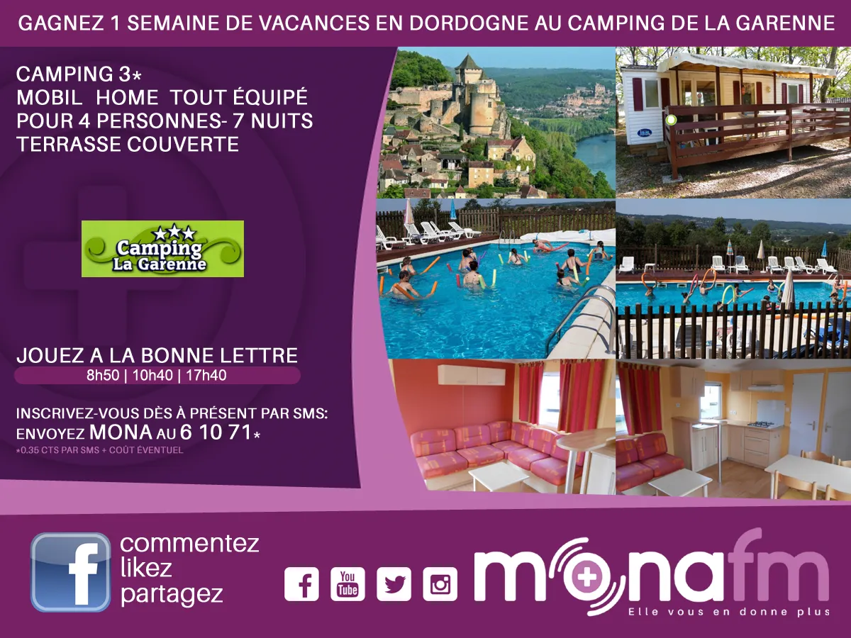 Mona FM vous offre 1 semaine de vacances en Dordogne Périgord au Camping de la Garenne