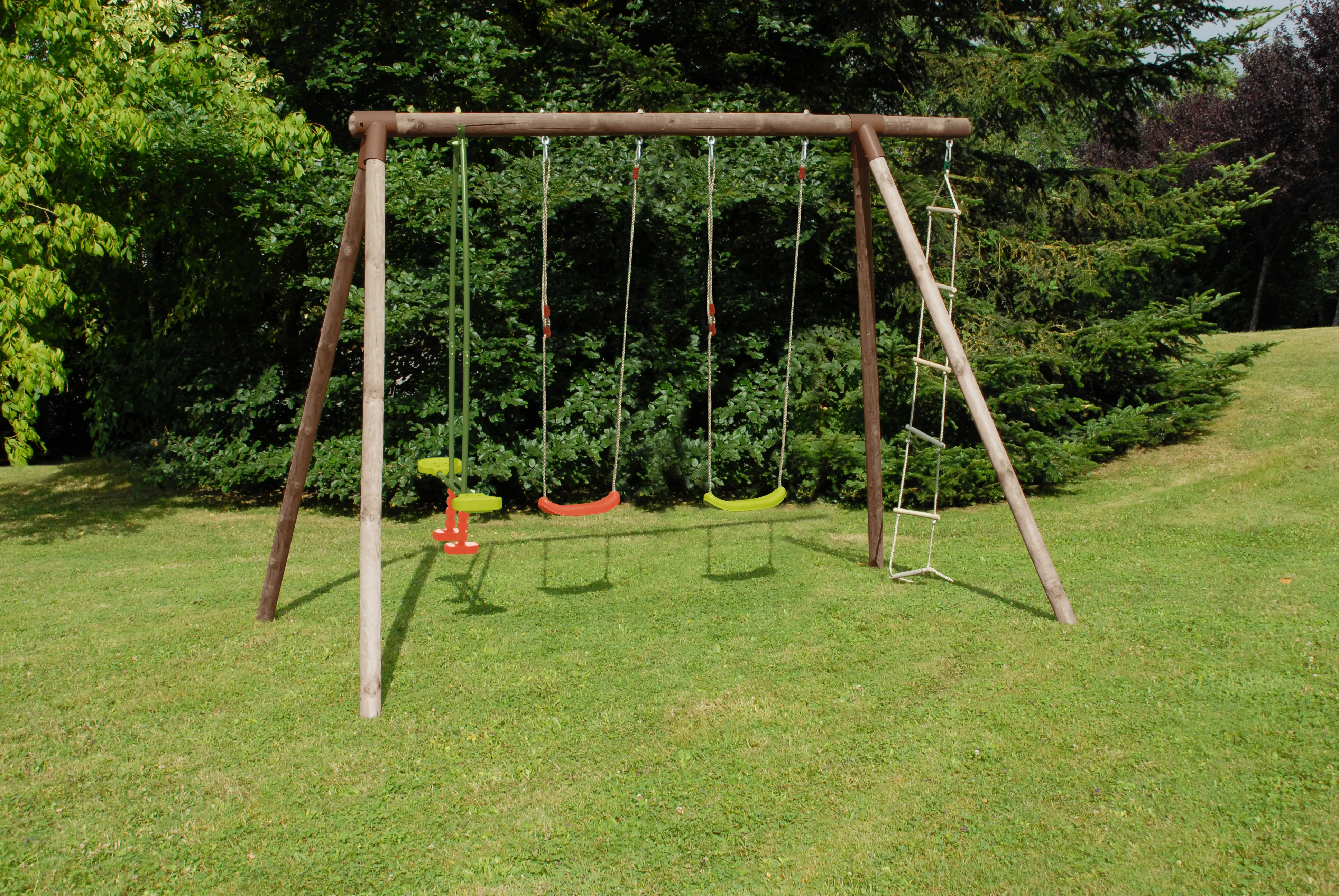 - Agrès : 2 balançoires plastique, 1 vis-à-vis avec protection anti-chocs et tubes en acier galvanisé et 1 échelle de corde avec barreaux en bois